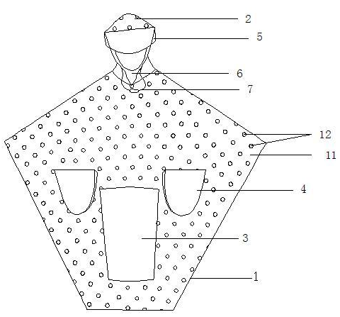 雨披本體的前片中間處有后視鏡罩,后視鏡罩由透明片材和含花式反光圖案層的雨披主體面料拼接而成,雨披本體的前片下部有燈罩,燈罩為透明片材。